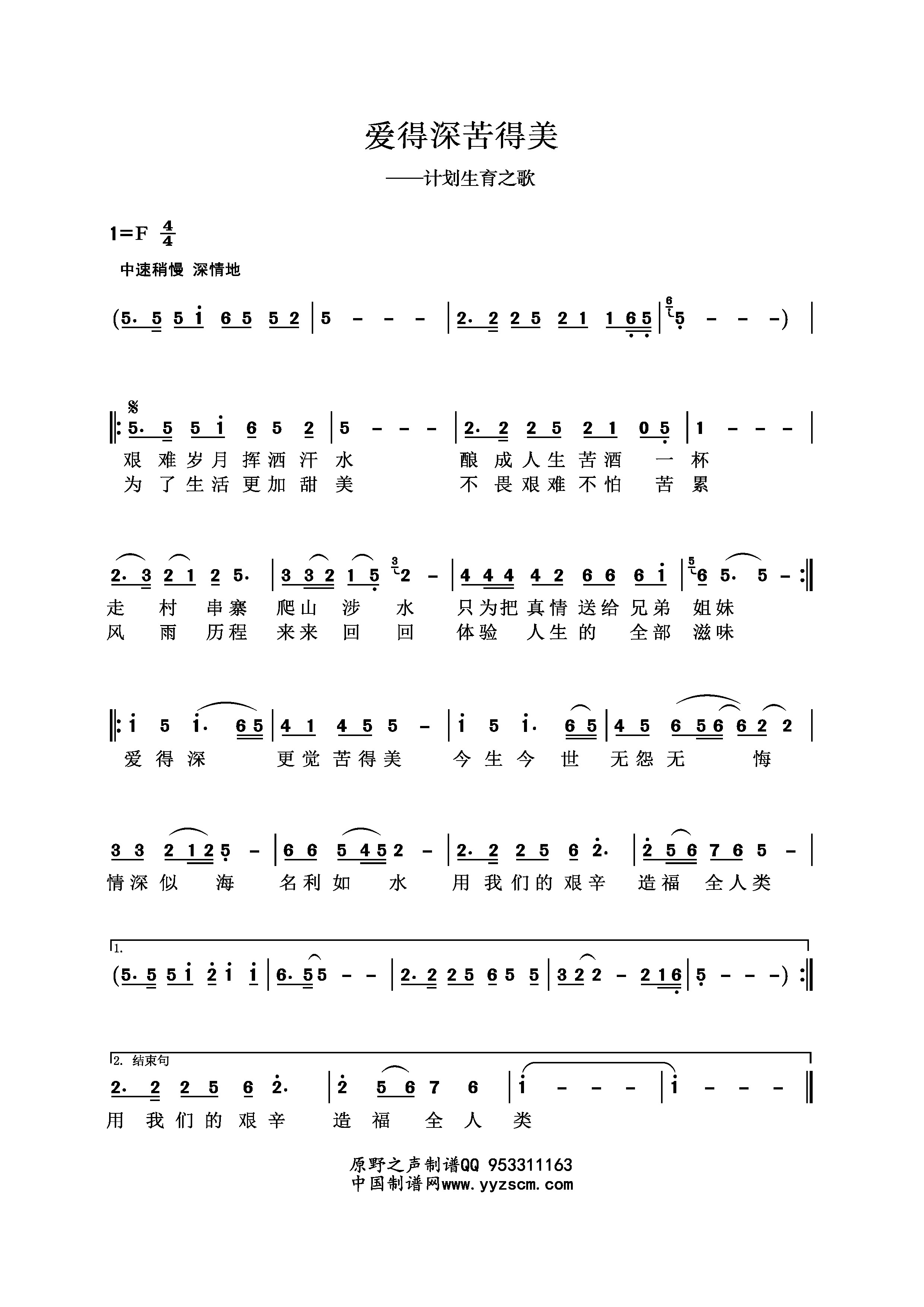 计划生育之歌演唱的爱得深苦得美歌词,爱得深苦得美简谱.