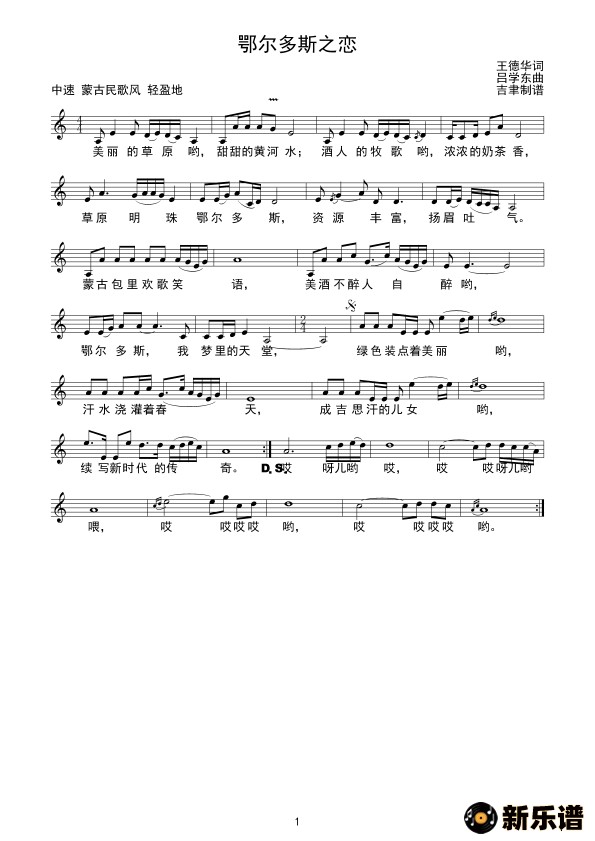演唱的鄂尔多斯之恋(线谱)歌词,鄂尔多斯之恋(线谱)简谱.