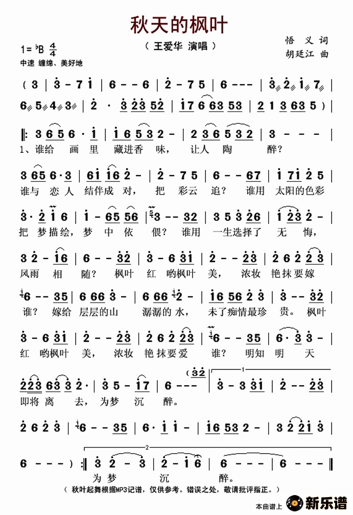 王爱华演唱的秋天的枫叶歌词,秋天的枫叶简谱.