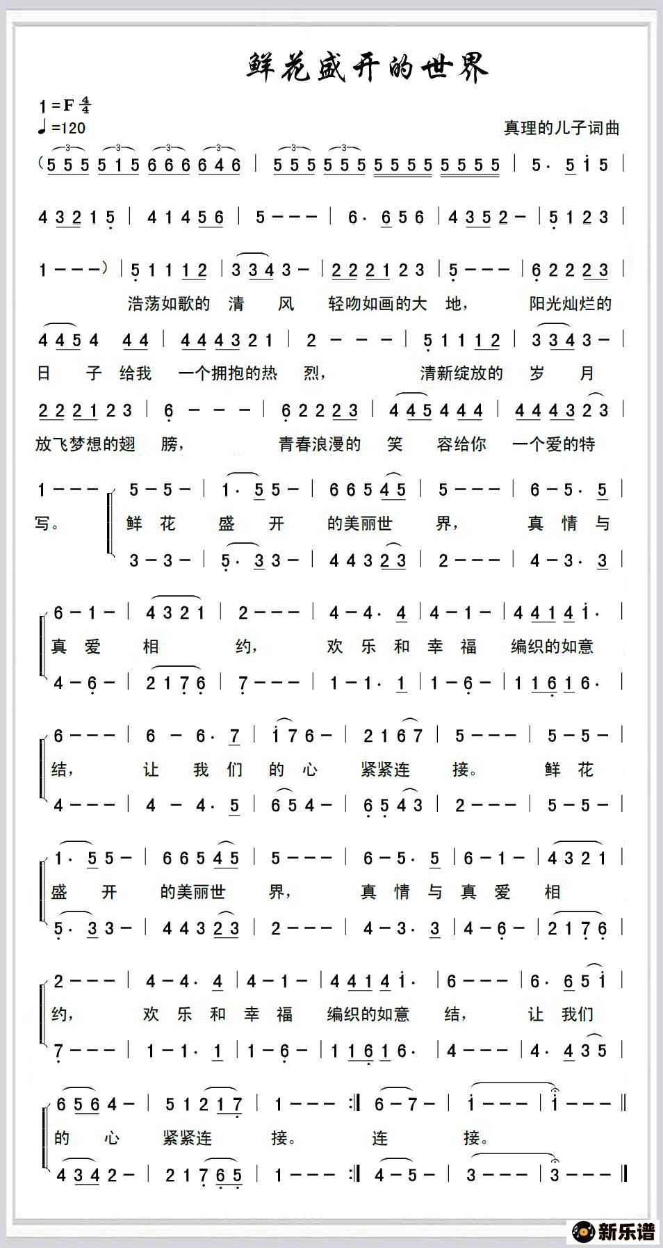 [原创]鲜花盛开的世界慕晴、金奕鸣 慕晴、金奕鸣演唱的[原创]鲜花盛开的世界歌词,[原创]鲜花盛开的世界简谱. 歌曲试听地址:http://5sing.kugou.com/yc/1682663.html