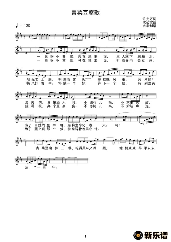 演唱的青菜豆腐歌(线谱)歌词,青菜豆腐歌(线谱)简谱.