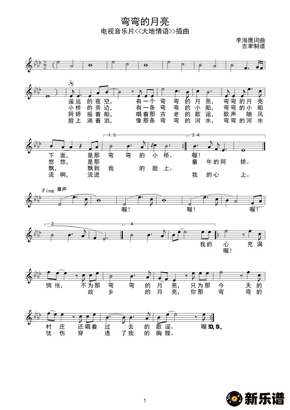 演唱的弯弯的月亮(线谱)歌词,弯弯的月亮(线谱)简谱.