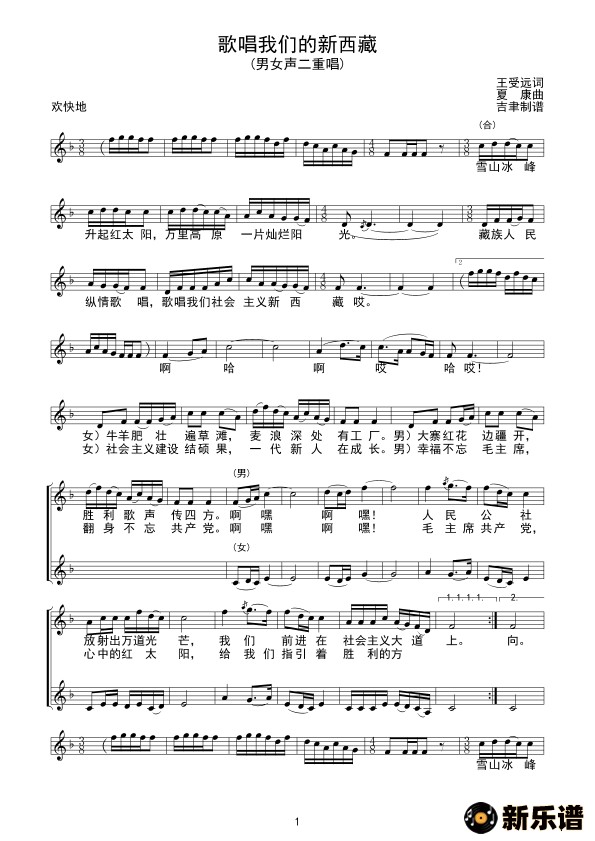 演唱的歌唱我们的新西藏(线谱)歌词,歌唱我们的新西藏(线谱)简谱.