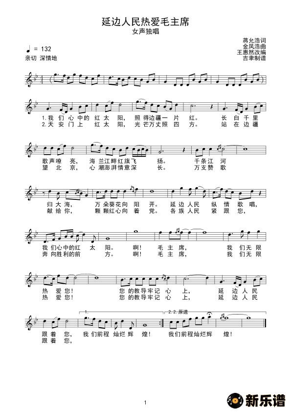 演唱的延边人民热爱毛主席(线谱)歌词,延边人民热爱毛主席(线谱)简谱.