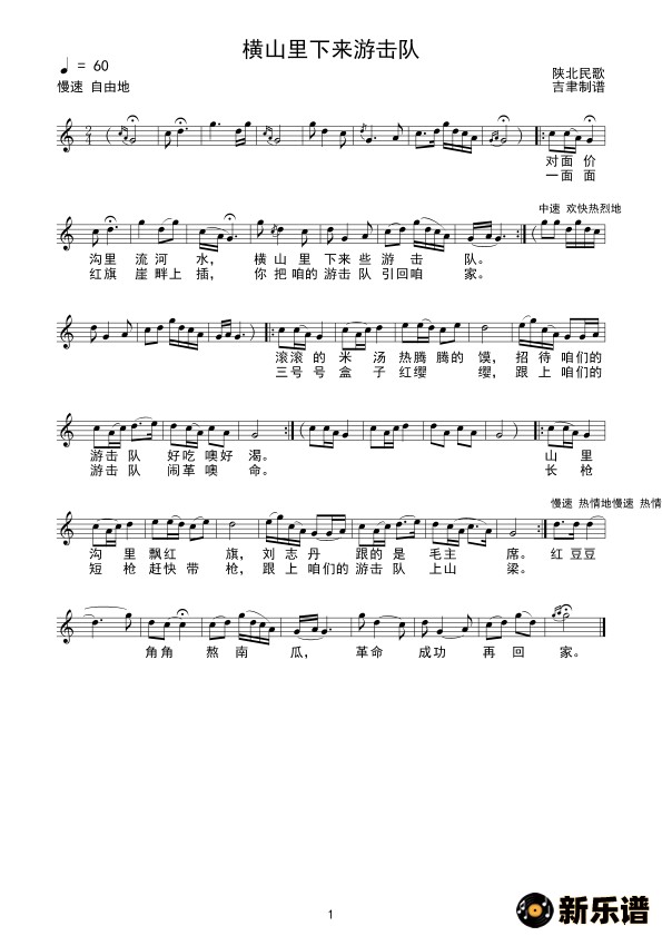 演唱的横山里下来游击队(线谱)歌词,横山里下来游击队(线谱)简谱.