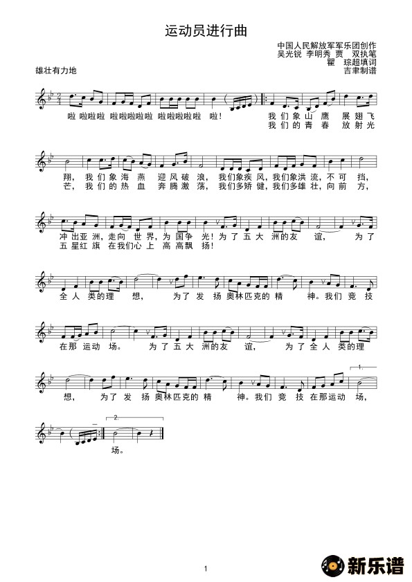 演唱的运动员进行曲(合唱) 线谱歌词,运动员进行曲(合唱) 线谱简谱.