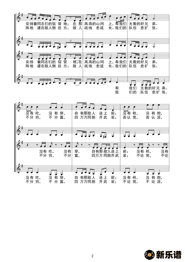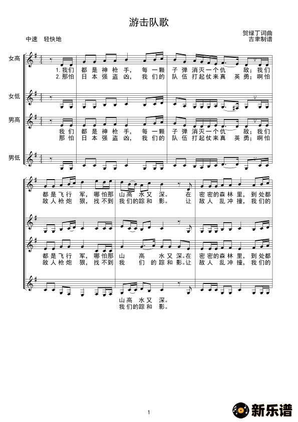 演唱的游击队歌(线谱)歌词,游击队歌(线谱)简谱.