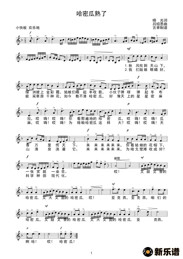 演唱的哈密瓜熟了(线谱)歌词,哈密瓜熟了(线谱)简谱.