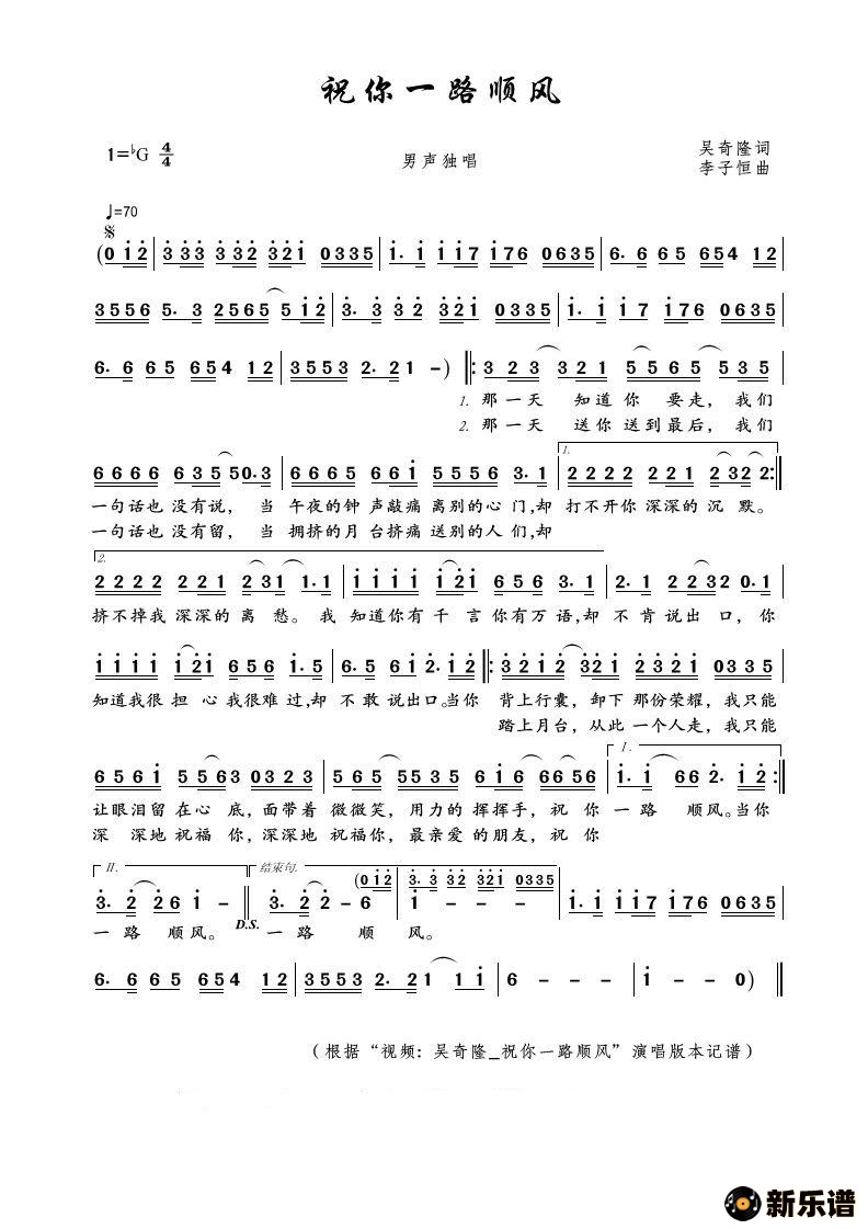 吴奇隆演唱的祝你一路顺风歌词,祝你一路顺风简谱.