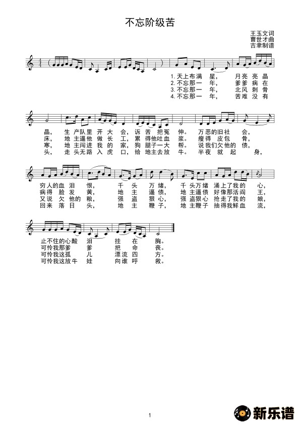 演唱的不忘阶级苦(线谱)歌词,不忘阶级苦(线谱)简谱.