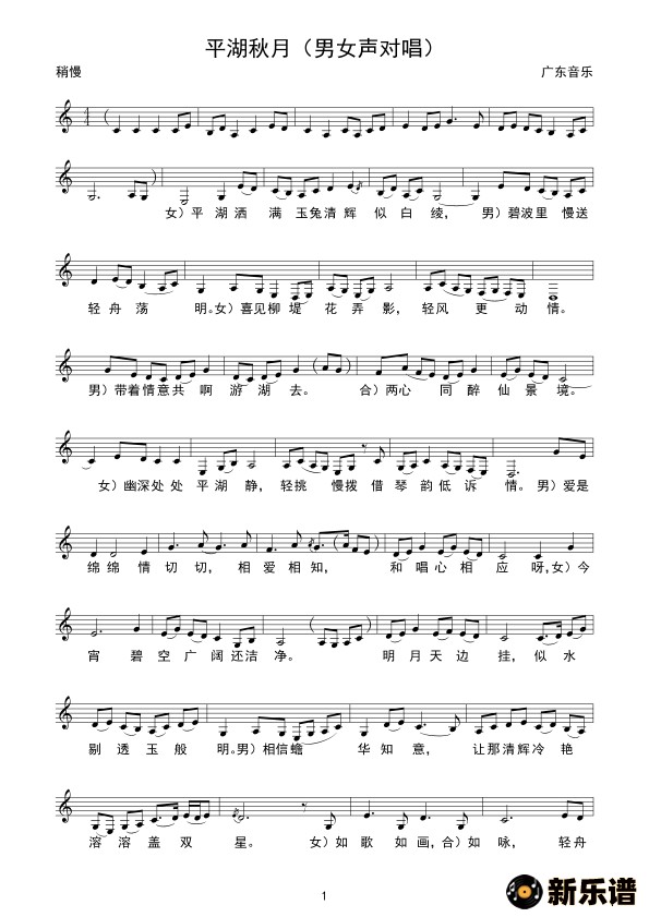 演唱的平湖秋月(男女声对唱)线谱歌词,平湖秋月(男女声对唱)线谱简谱.