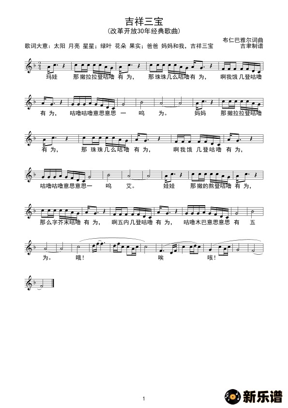 演唱的吉祥三宝(汉语版) 线谱歌词,吉祥三宝(汉语版) 线谱简谱.