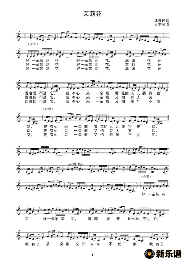 演唱的茉莉花(线谱)歌词,茉莉花(线谱)简谱.
