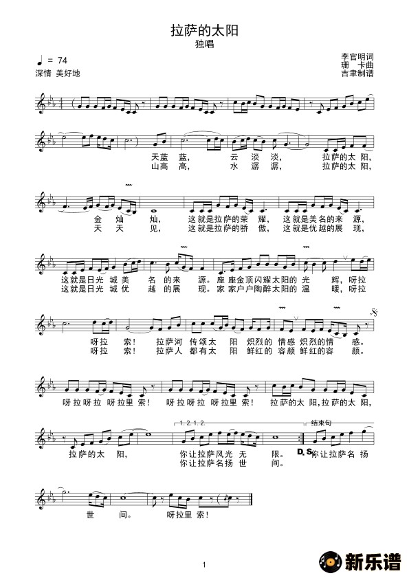 演唱的拉萨的太阳(线谱)歌词,拉萨的太阳(线谱)简谱.