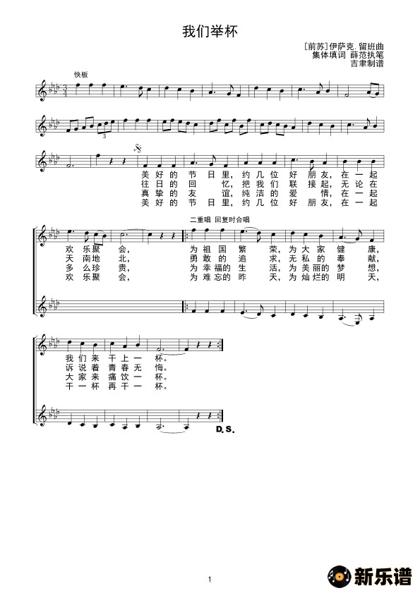 演唱的我们举杯(线谱)歌词,我们举杯(线谱)简谱.