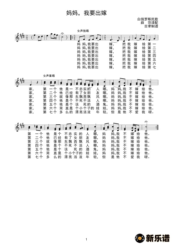 演唱的妈妈,我要出嫁(线谱)歌词,妈妈,我要出嫁(线谱)简谱.