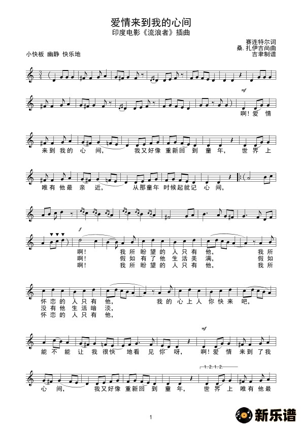 演唱的爱情来到我的心间(线谱)歌词,爱情来到我的心间(线谱)简谱.