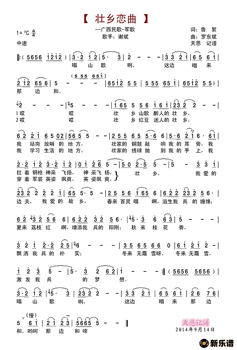 谢斌演唱的壮乡恋曲--广西民歌-军歌歌词,壮乡恋曲--广西民歌-军歌简谱.