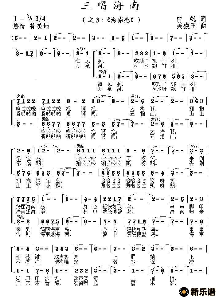 演唱的海南恋(组歌《三唱海南》之三)歌词,海南恋(组歌《三唱海南》之三)简谱.