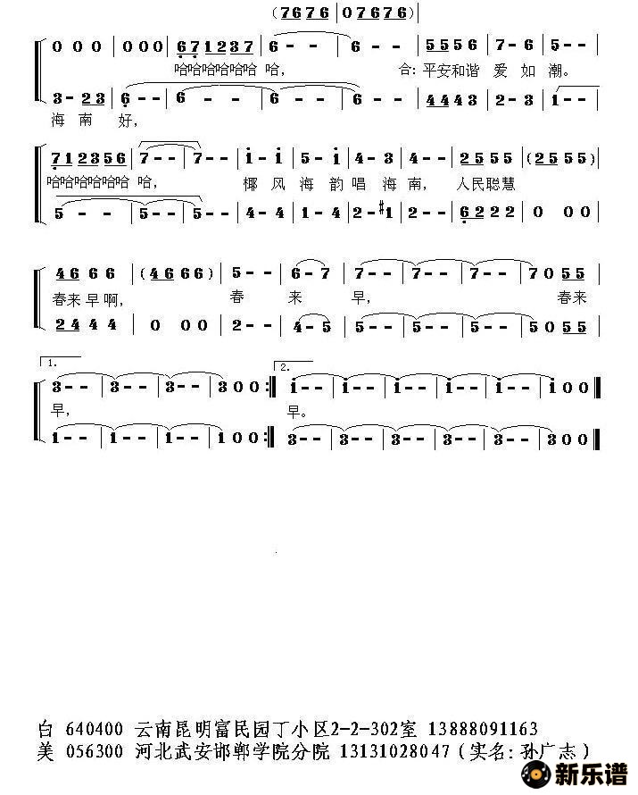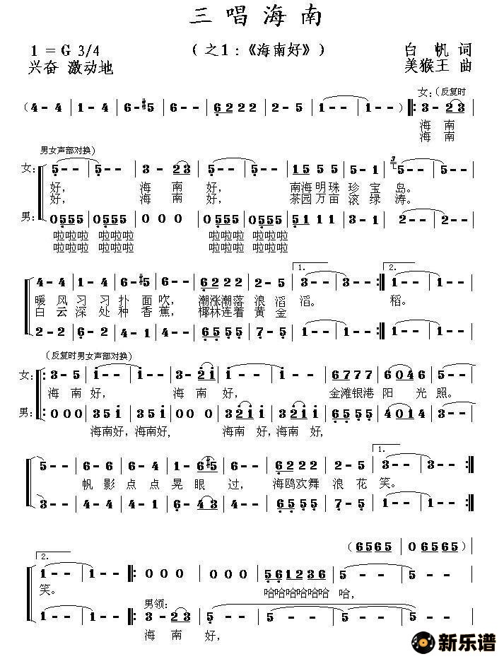 演唱的海南好(组歌《三唱海南》之一)歌词,海南好(组歌《三唱海南》之一)简谱.