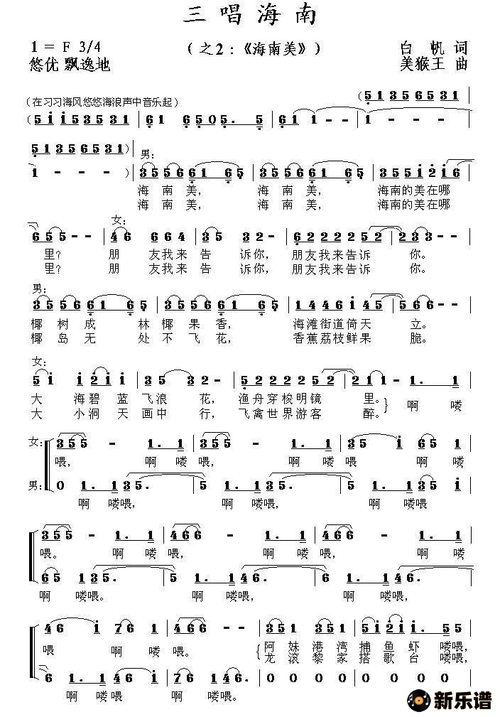 演唱的海南美(组歌《三唱海南》之二)歌词,海南美(组歌《三唱海南》之二)简谱.