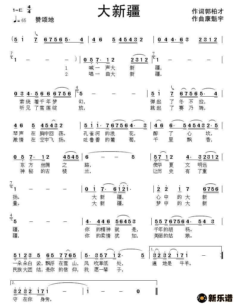 演唱的大新疆歌词,大新疆简谱.
