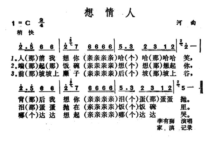 山西河曲民歌演唱的想情人歌词,想情人简谱.
