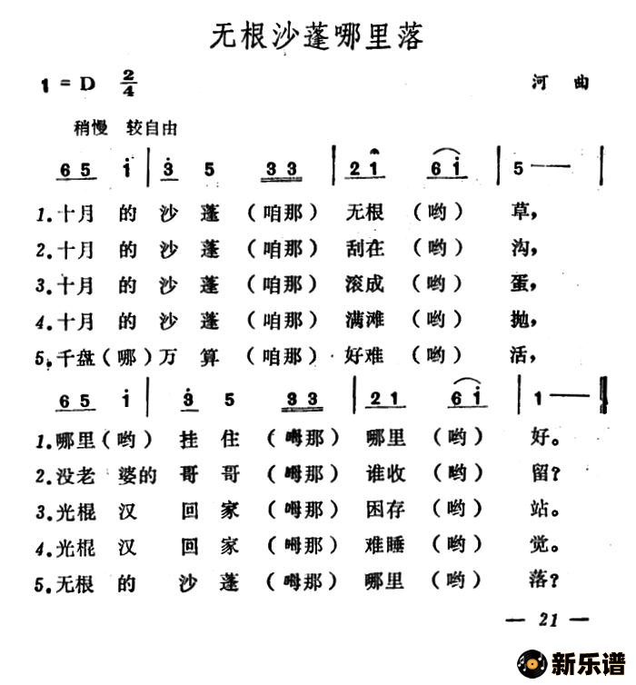 《无根沙蓬哪里落》简谱 山西河曲民歌