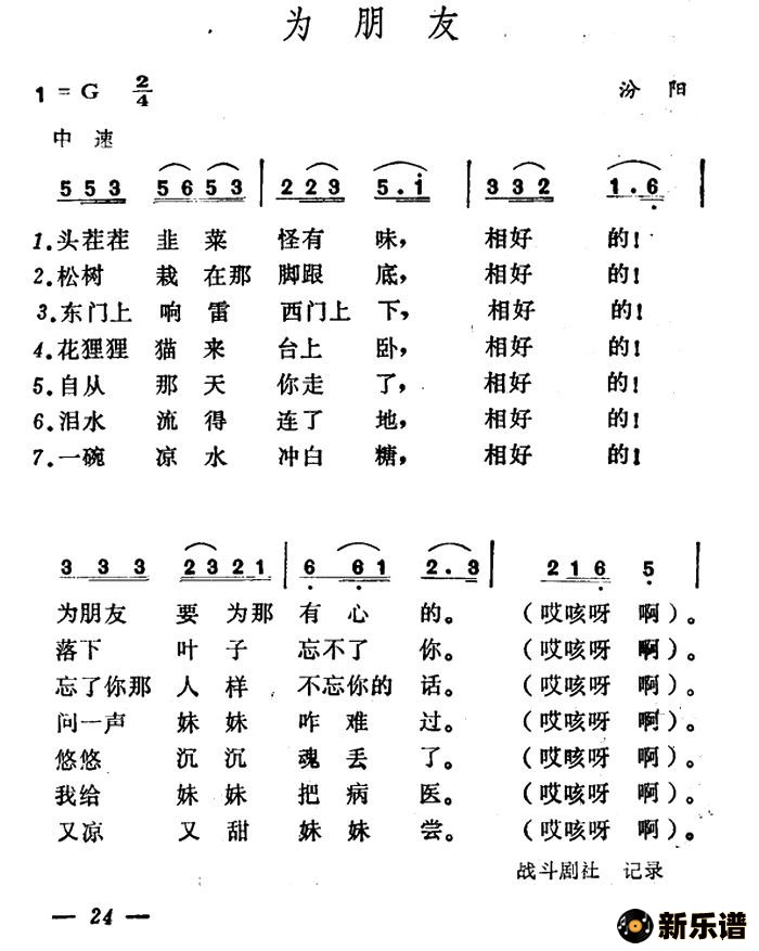 演唱的为朋友(山西汾阳民歌)歌词,为朋友(山西汾阳民歌)简谱.