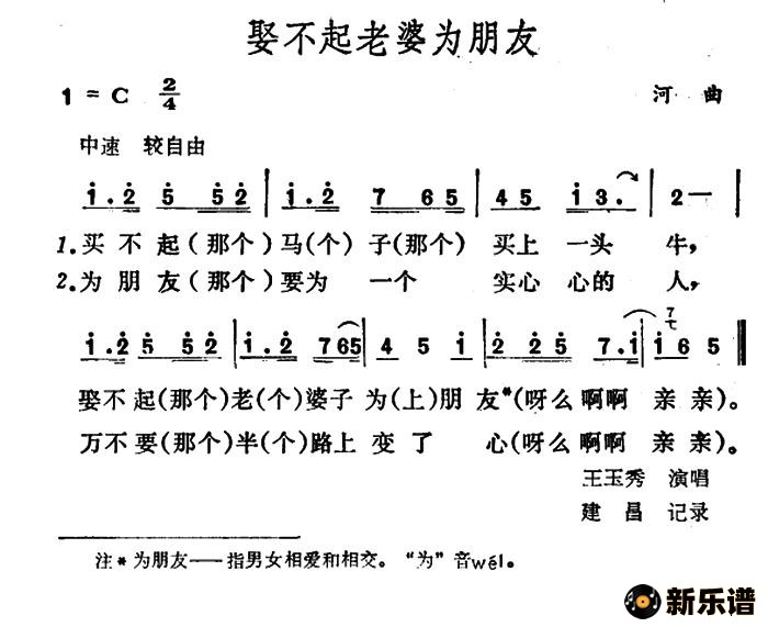 《娶不起老婆为朋友》简谱 山西河曲民歌