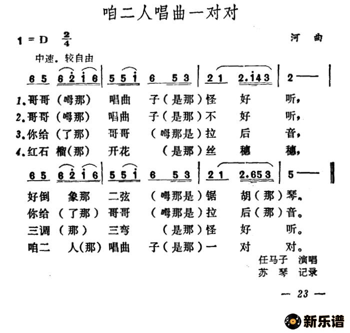 山西河曲民歌演唱的咱二人唱曲一对对歌词,咱二人唱曲一对对简谱.