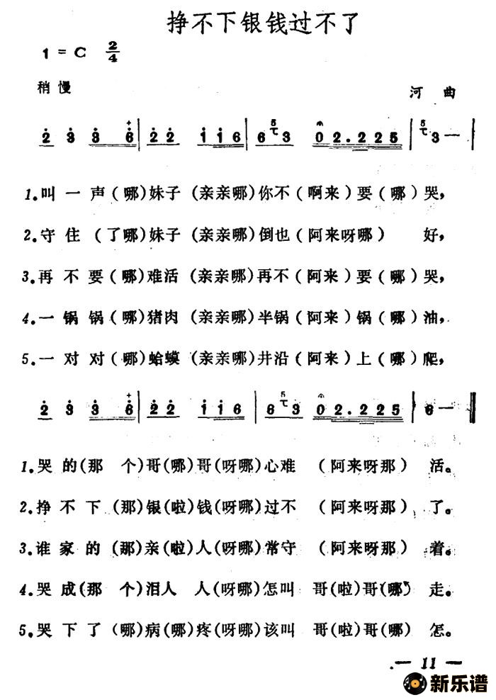 山西河曲民歌演唱的挣不下银钱过不了歌词,挣不下银钱过不了简谱.