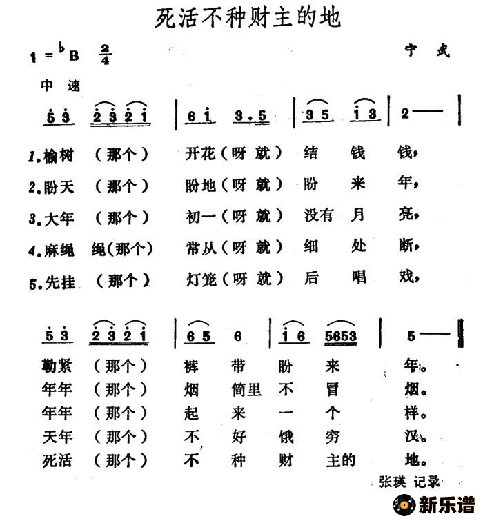 山西 宁武民歌演唱的死活不种财主的地歌词,死活不种财主的地简谱.