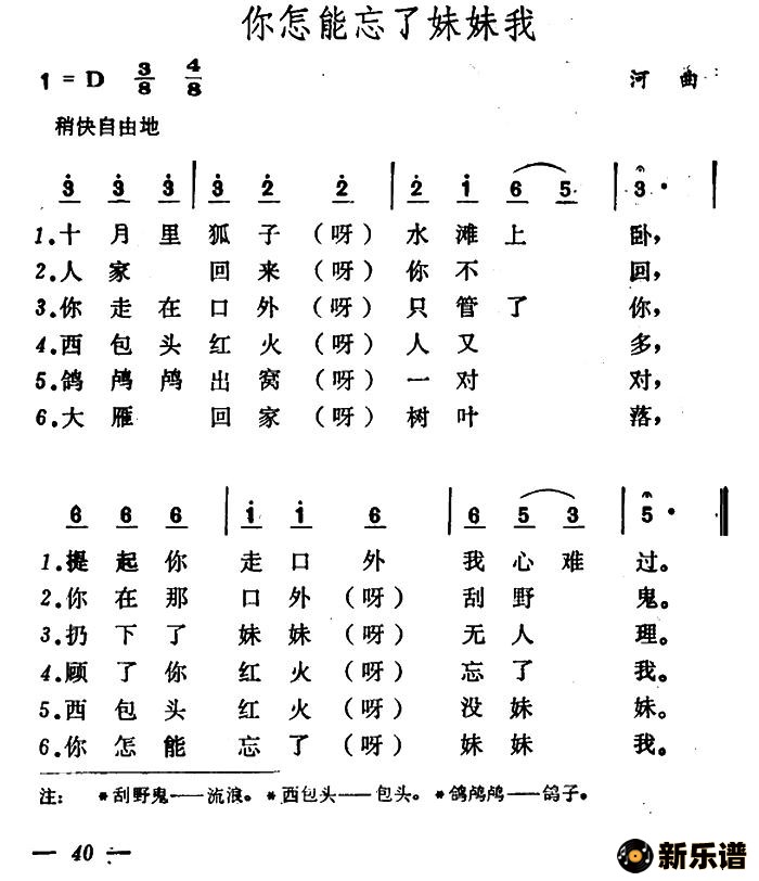 山西河曲民歌演唱的你怎能忘了妹妹我歌词,你怎能忘了妹妹我简谱.