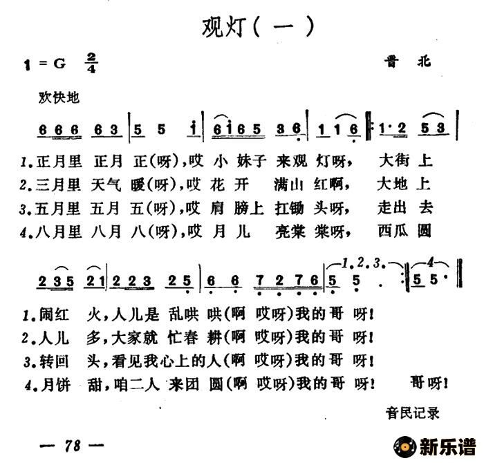 演唱的观灯(2首)(山西晋北、曲沃小调)歌词,观灯(2首)(山西晋北、曲沃小调)简谱.
