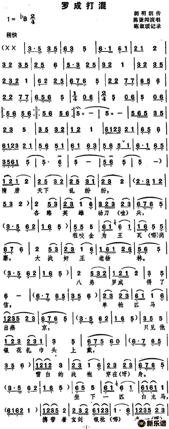 陈谦闻演唱的[湖北大鼓]罗成打混歌词,[湖北大鼓]罗成打混简谱.
