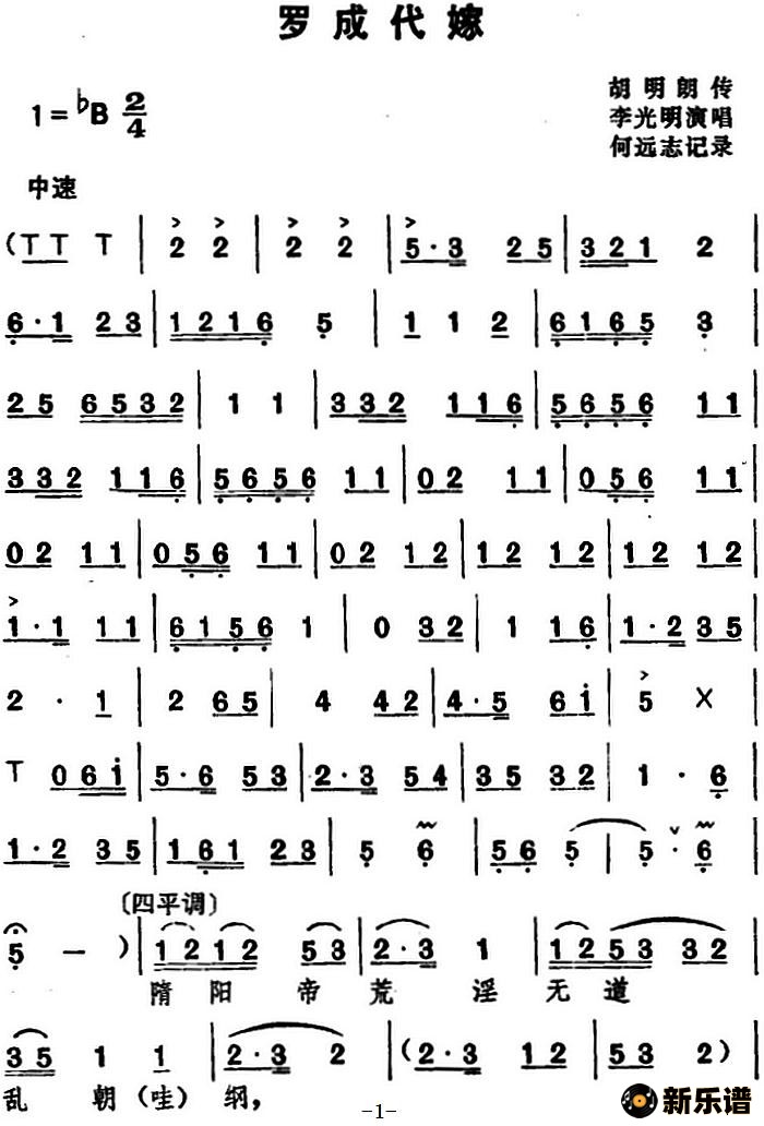 李光明演唱的[湖北大鼓]罗成代嫁歌词,[湖北大鼓]罗成代嫁简谱.