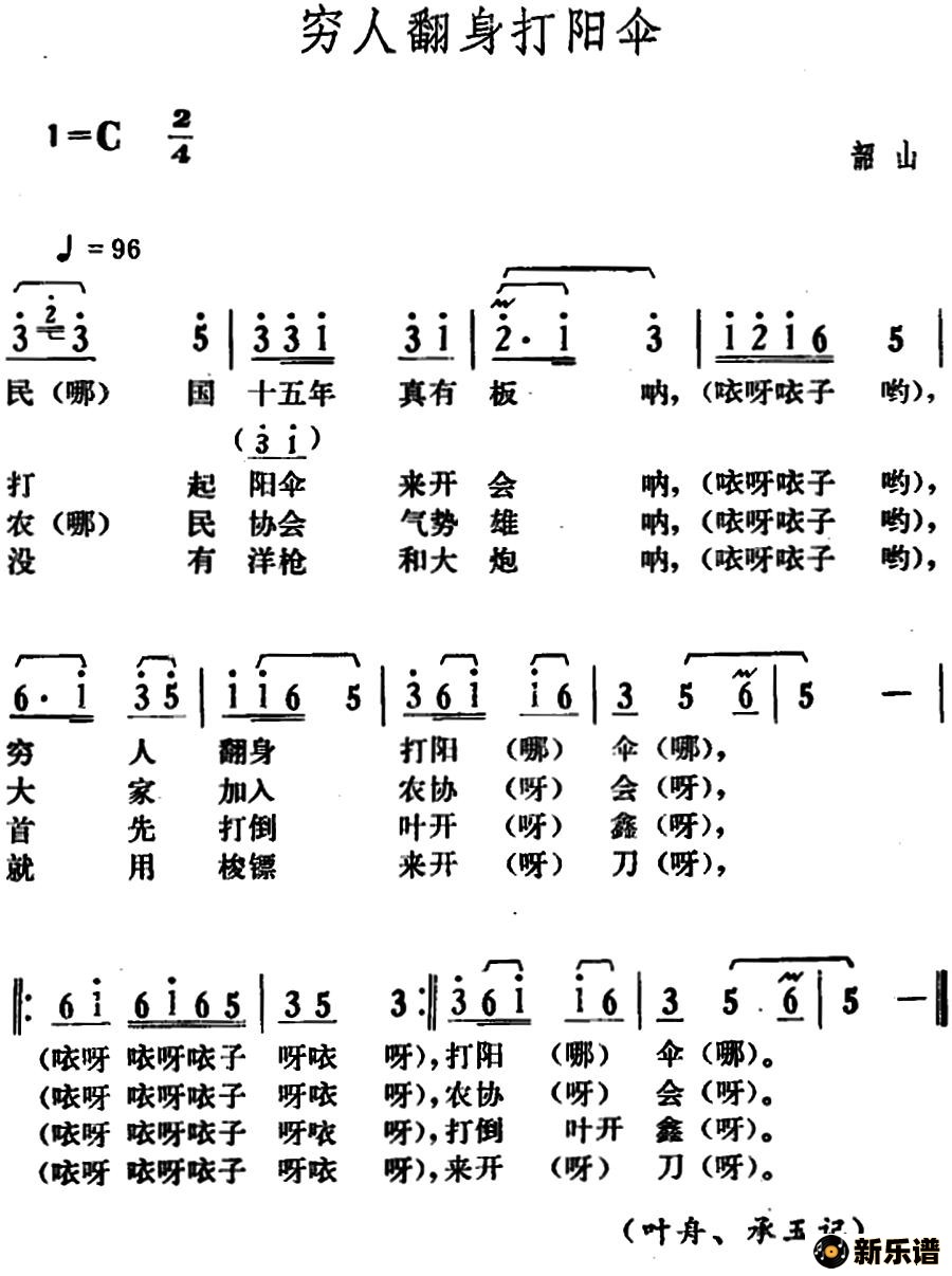 湖南韶山革命民歌演唱的穷人翻身打阳伞歌词,穷人翻身打阳伞简谱.