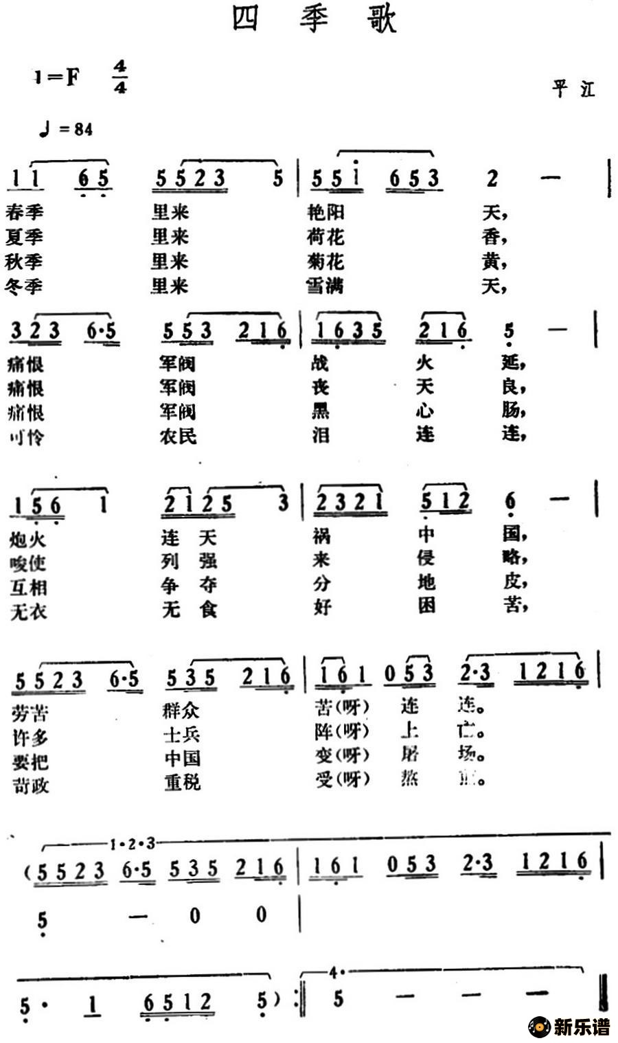 演唱的四季歌(湖南平江革命民歌)歌词,四季歌(湖南平江革命民歌)简谱.
