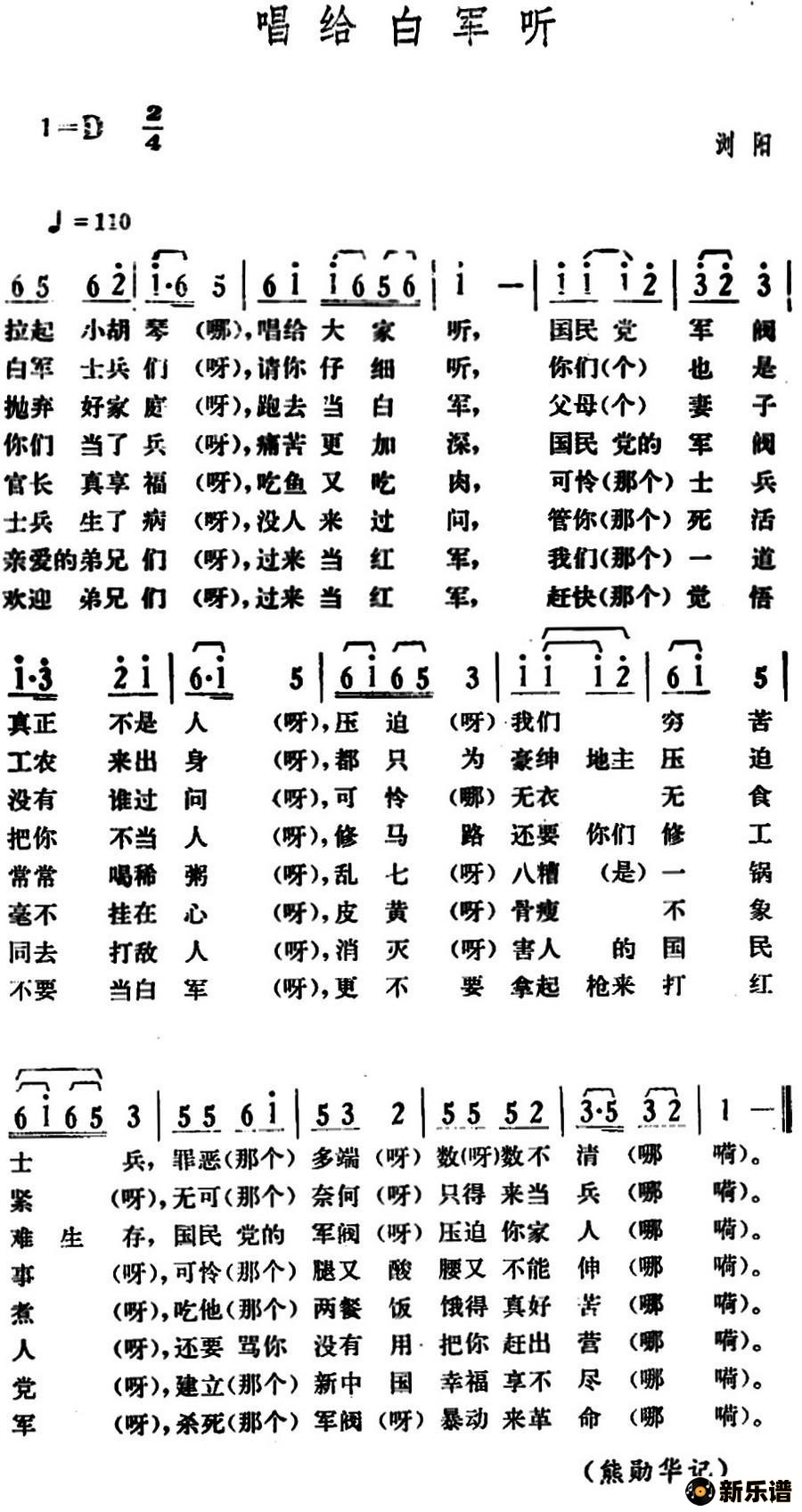 湖南浏阳革命民歌演唱的唱给白军听歌词,唱给白军听简谱.