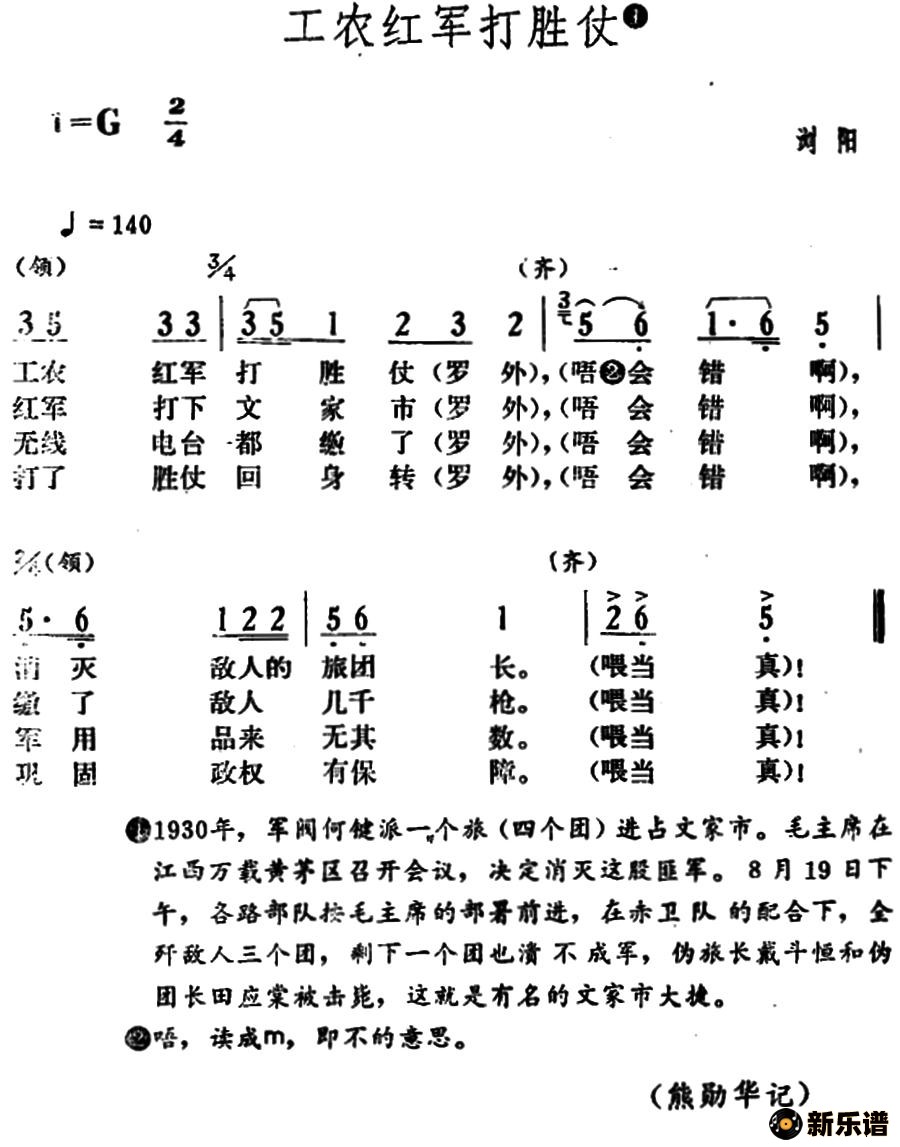湖南浏阳革命民歌演唱的工农红军打胜仗歌词,工农红军打胜仗简谱.