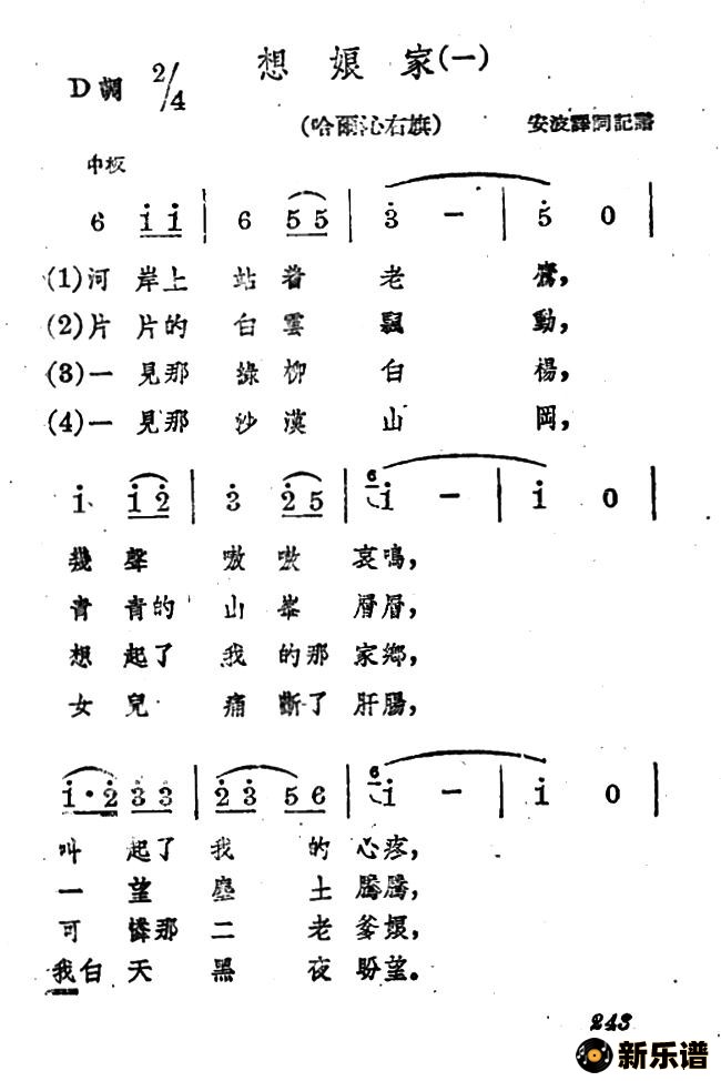 蒙古族民歌、安波配歌演唱的想娘家(二首)歌词,想娘家(二首)简谱.