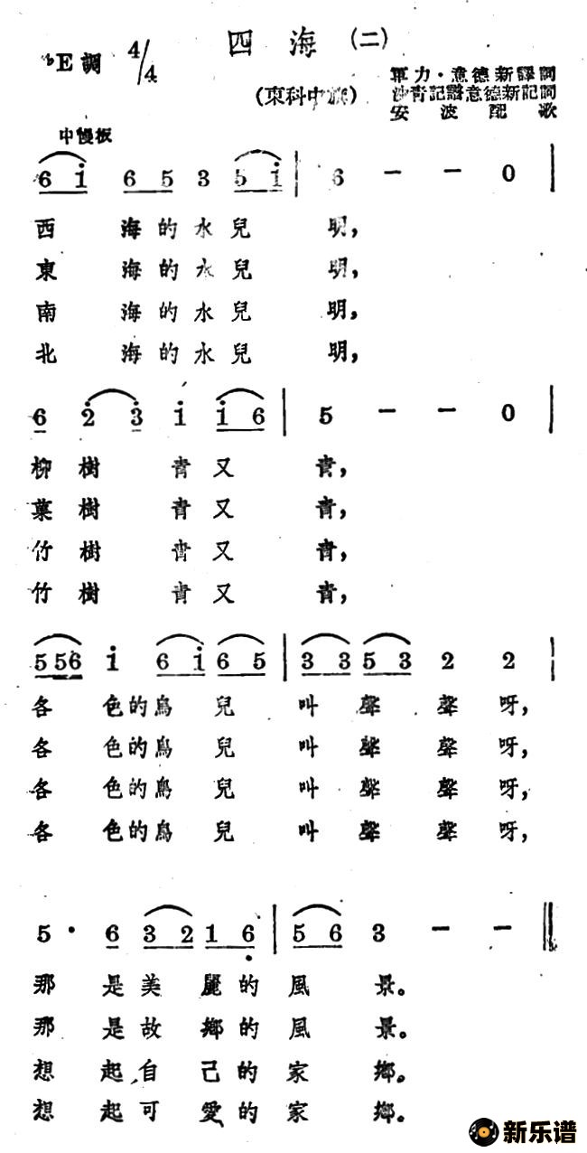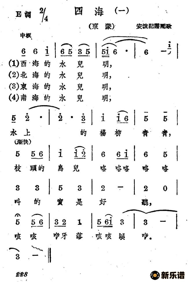 蒙古族民歌、安波译词配歌演唱的四海(二首)歌词,四海(二首)简谱.