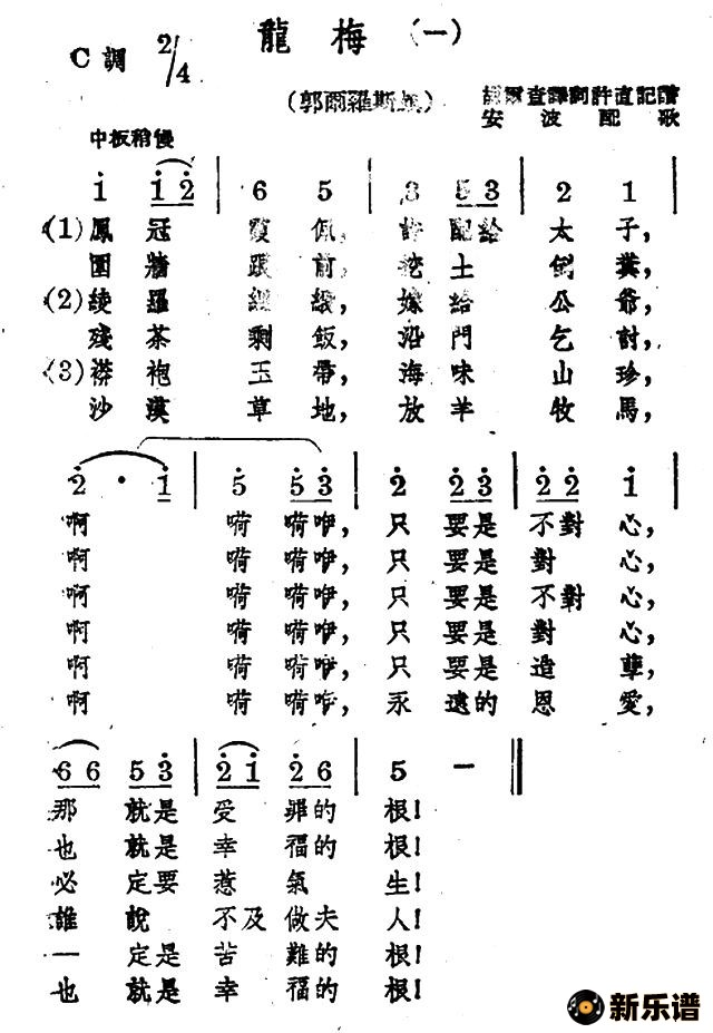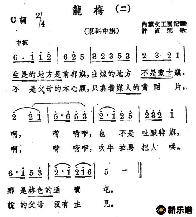 蒙古族民歌、安波、许直配歌演唱的龙梅(二首)歌词,龙梅(二首)简谱.