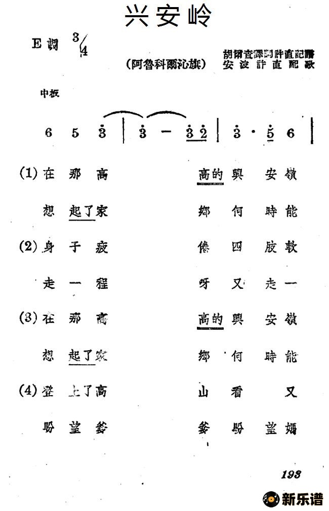 蒙古族民歌、安波、许值配歌演唱的兴安岭歌词,兴安岭简谱.