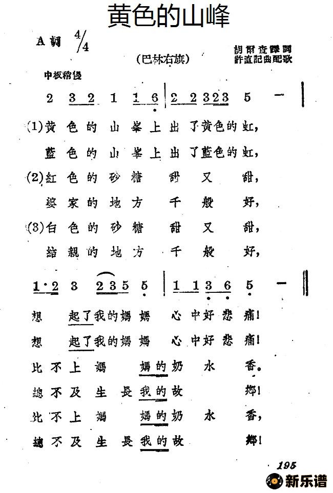 蒙古族民歌、许值记曲配歌演唱的黄色的山峰歌词,黄色的山峰简谱.