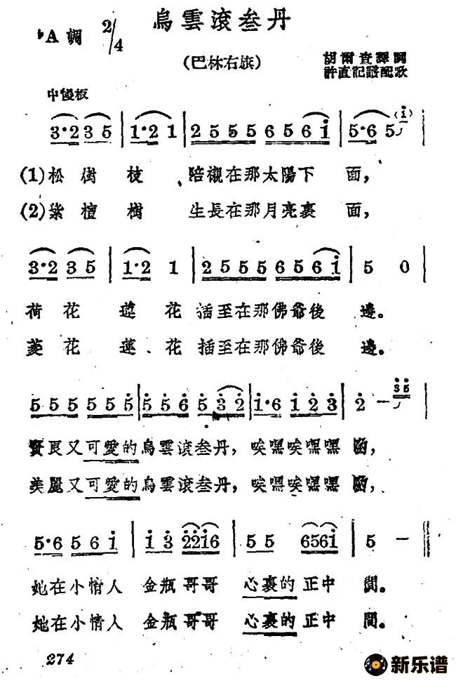 蒙古族民歌、许直记谱配歌演唱的乌云滚叁丹歌词,乌云滚叁丹简谱.