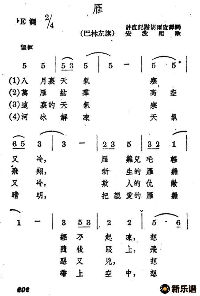 蒙古族民歌、安波配歌演唱的雁歌词,雁简谱.