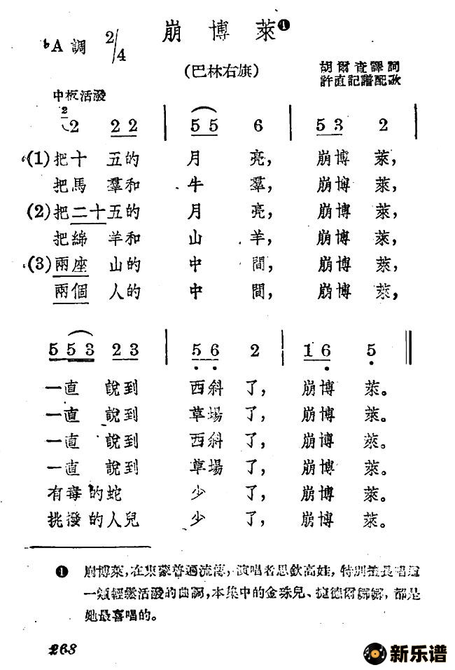 蒙古族民歌、许直记谱配歌演唱的崩博莱歌词,崩博莱简谱.