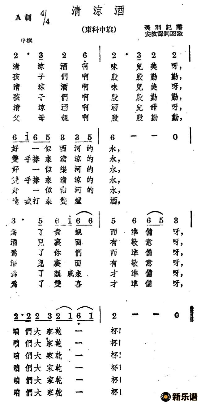 蒙古族民歌、安波译词配歌演唱的清凉酒歌词,清凉酒简谱.